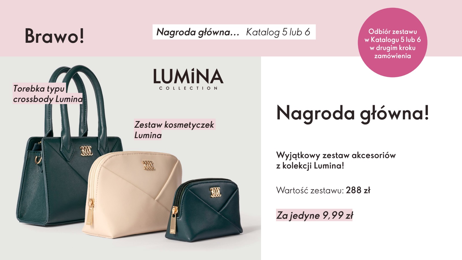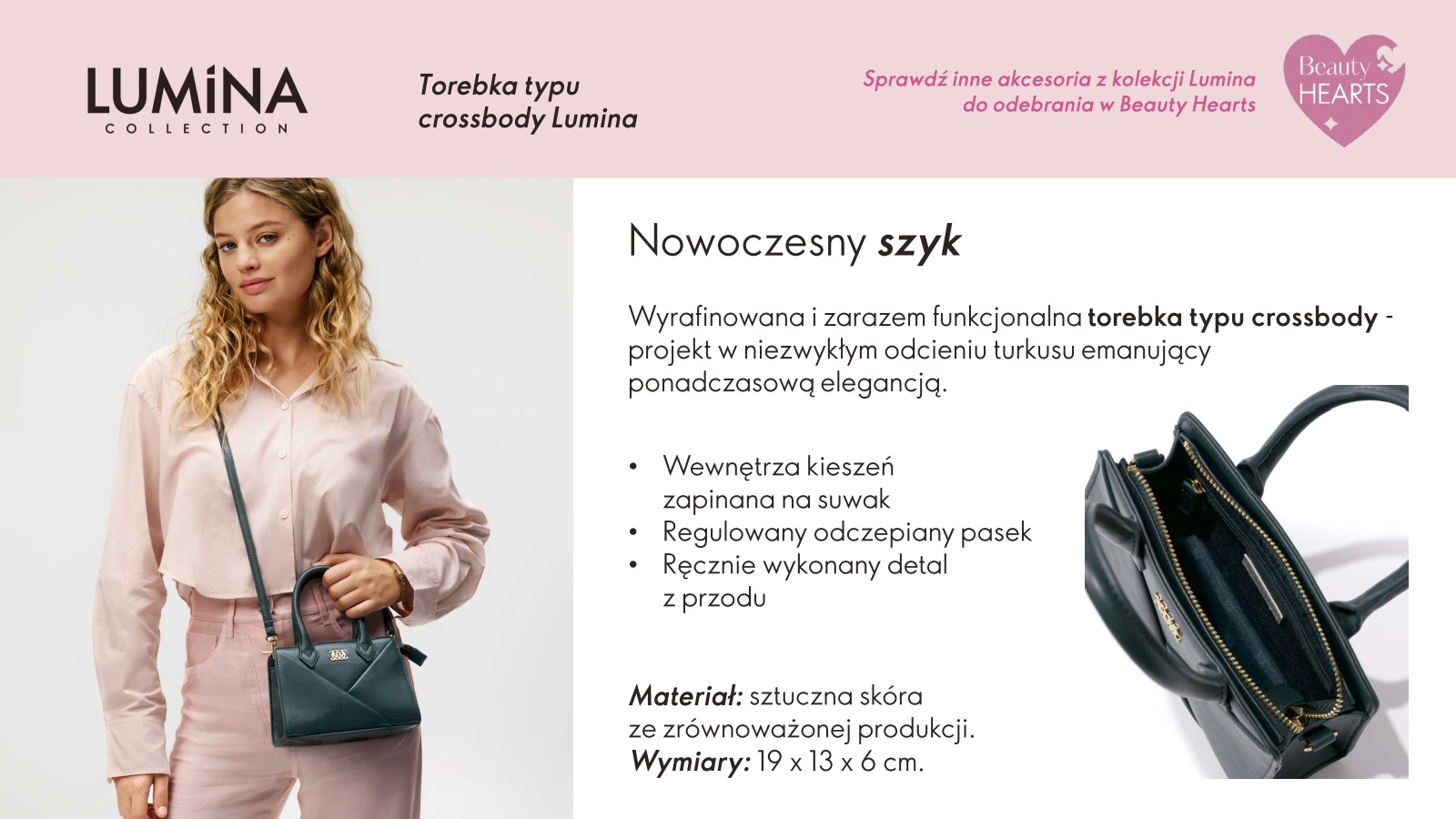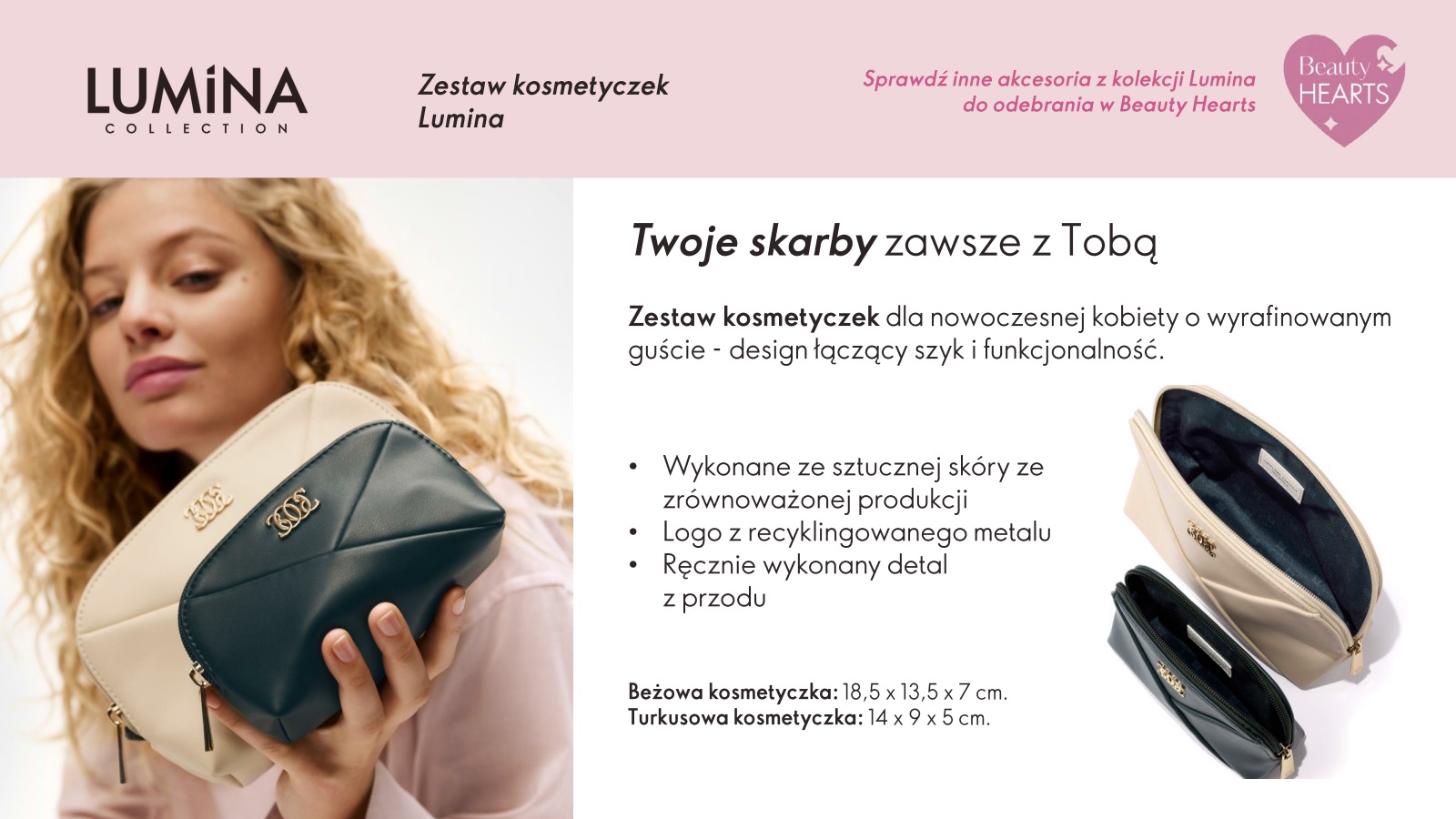 W walentynkowym Programie Witamy w Oriflame zdobądź elegancki zestaw damskich akcesoriów z kolekcji Lumina – wyrafinowaną torebkę typu crossbody w pięknym, modnym odcieniu turkusu oraz dwie funkcjonalne kosmetyczki różnej wielkości.