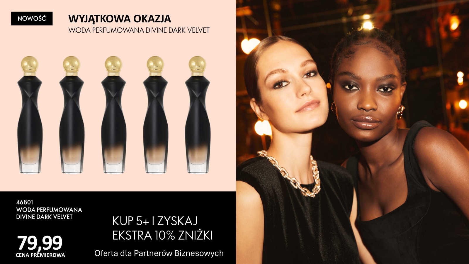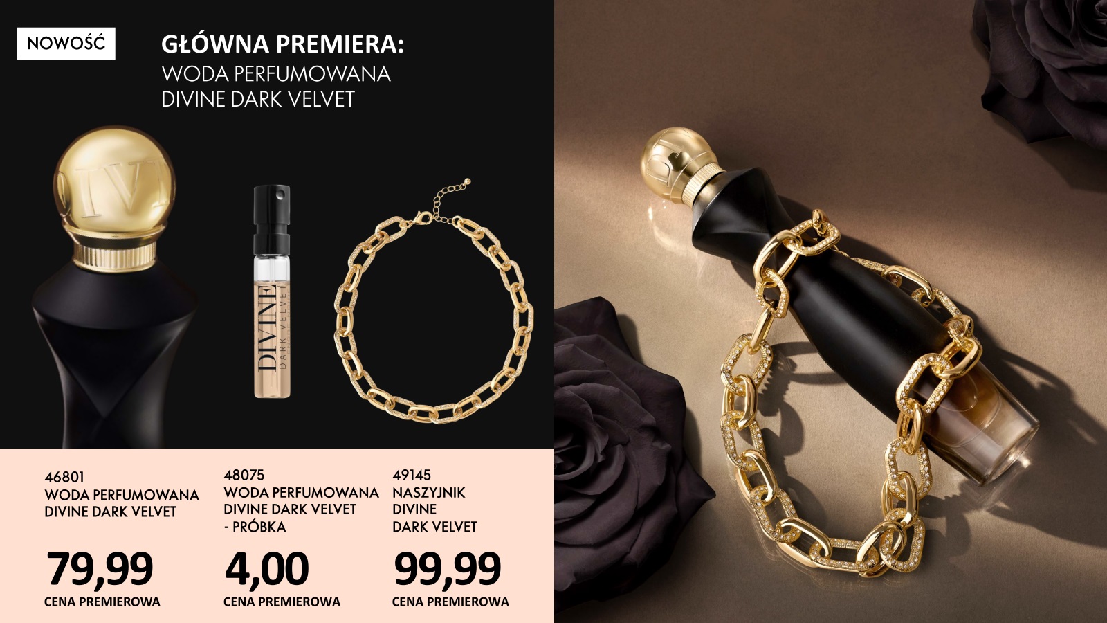 Spośród zimowych premier wybierz zmysłową, kwiatowo-drzewną kompozycję zapachową wody perfumowanej Divine Dark Velvet we flakonie inspirowanym sukniami haute couture i modny, efektowny naszyjnik w kolorze złota z błyszczącymi akcentami. To przyciągający uwagę duet, dopełniający Twój wieczorowy look.