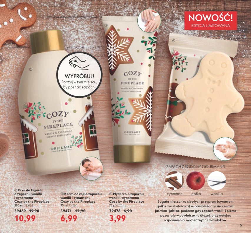 Pomyśl jak ten cudowny aromat wypełni powietrze i przeniesie cię z powrotem do krainy cudownych świątecznych wspomnień. Wszystko za sprawą zapachu gourmand (cynamon, wanilia, jabłko), bogatej mieszance ciepłych przypraw cynamonu i gałki muszkatołowej, wspaniale łączących się z nutami jaśminu, jabłka, wanilii i piżma. Przepełniona radością i wspaniale opakowana nowa kolekcja do kąpieli Cosy by the Fireplace stanowi idealny prezent.